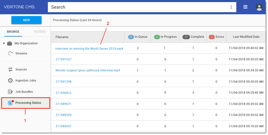 1. Click Processing Status on the left menu of the Data Center homepage. The Processing Status page opens and shows a log of all processing jobs for the past 24 hours.