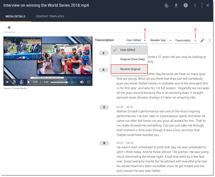 An edited transcript can be reverted to its original pre-edited state at any time. This feature cancels any edits that have been made to the transcript. To view the original transcript without losing any edits, see Switch Transcript View.