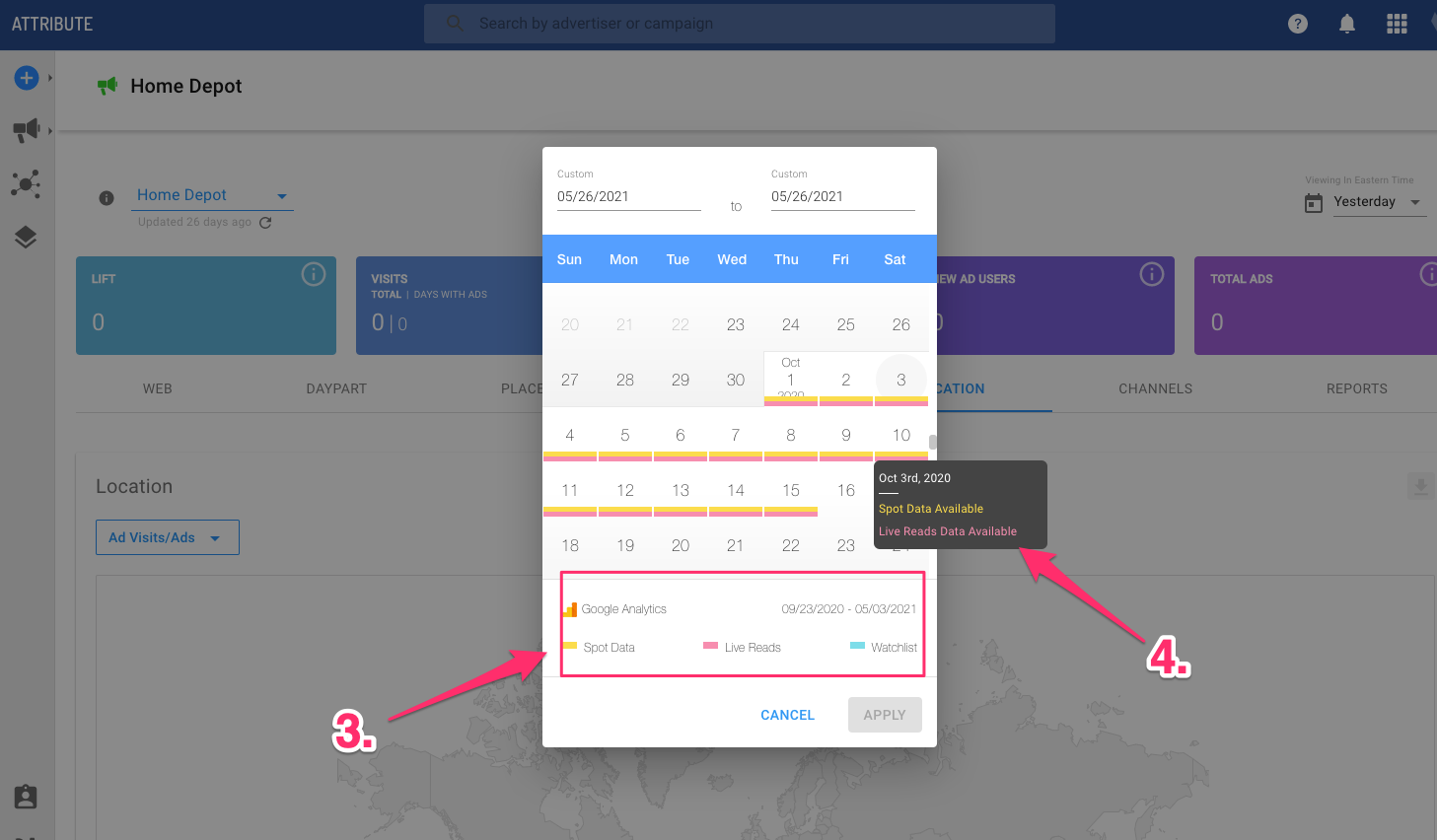 - A summary of available data types and date ranges displays at the bottom of the calendar. Corresponding color-coded indicators show on the calendar for Spot Data and Live Reads during the specified time periods.