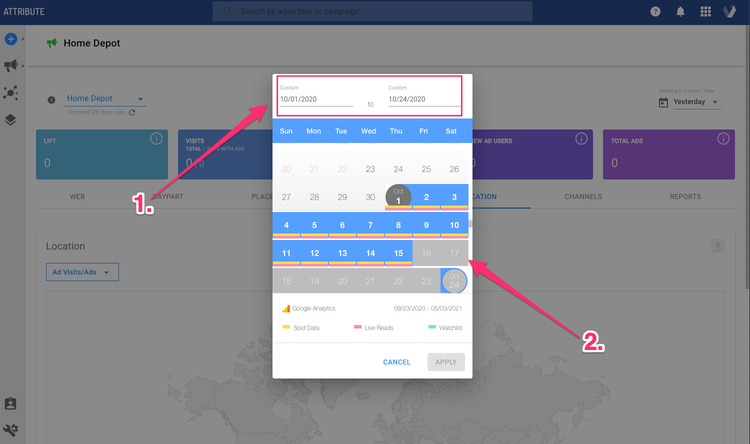 Selecting a custom date range lets you view data for a specific period of time. The custom timeframe option uses an interactive calendar to quickly and easily navigate to specific months, select dates, and see the types of data available.