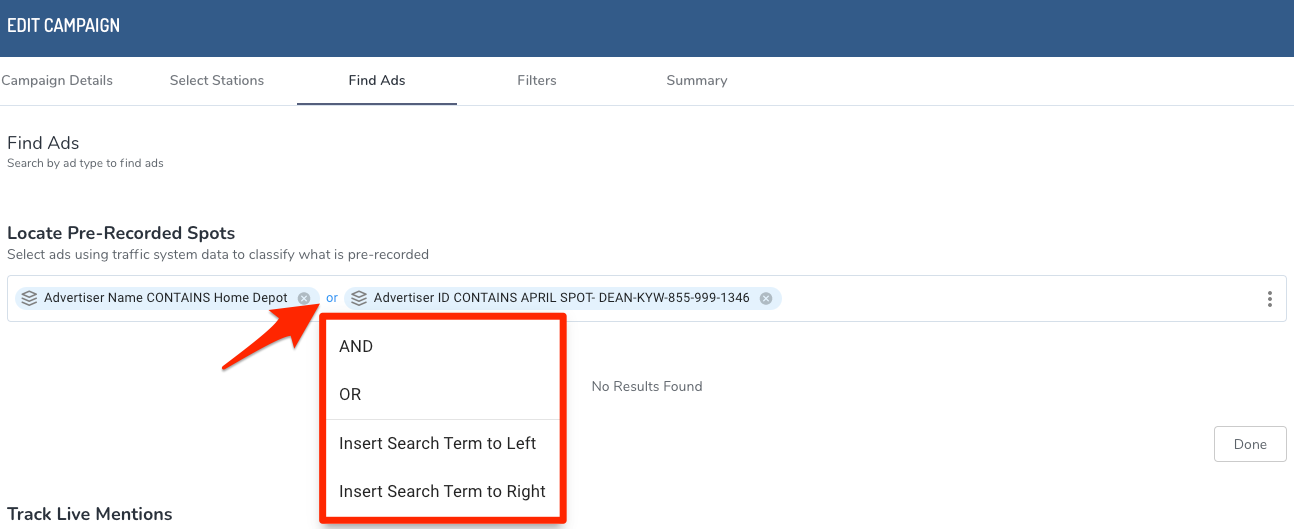 Users configure searches within Campaigns to track ads in Attribute. In addition to using keywords to capture organic mentions, our search engine can query events we receive from your traffic or station playout system to find scheduled spots. You can also leverage search operators to refine your search and hone in on specific content.