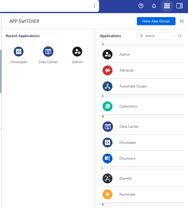 Select the App Switcher icon to open the App Switcher panel and access available applications for your account. The last six applications that have been accessed from your account will be stored in the Recent Application section of your app switcher.