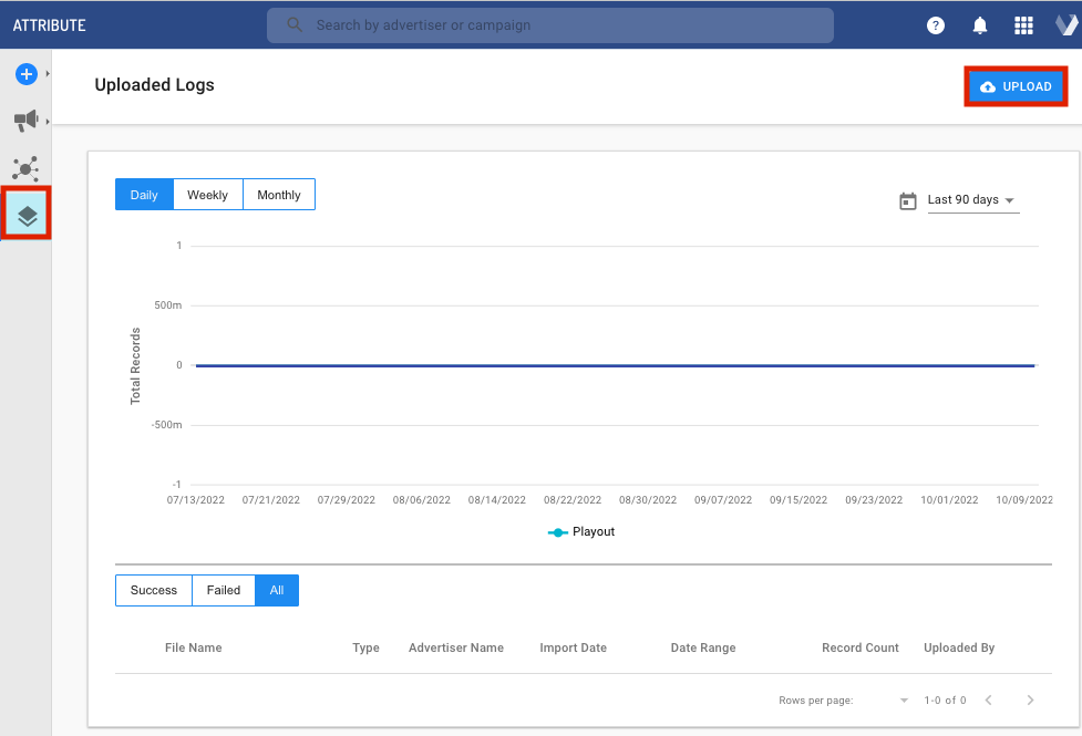 The Playout Uploader is a manual resource that will require you to independently source and upload your logs directly into the platform. The Playout Uploader is used for cases where spot logs might not be available automatically or easily accessible in Veritone Attribute. This might include forms of sports play x play coverage, regional custom networks, or promotional inventory that cannot be picked up through keyword search in the platform.