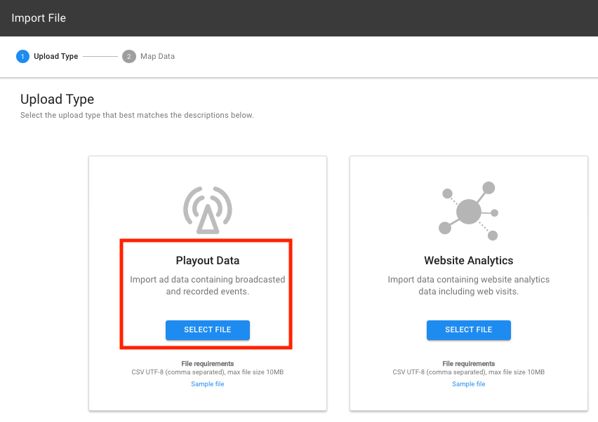 - Under Playout Data, click Select File. CSV UTF-8 format is required.