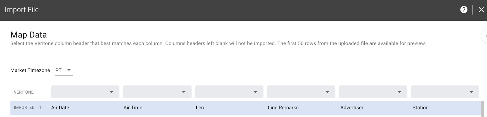 - Once the file is uploaded, you will now map the data columns in the uploaded file to Veritone's required fields. To do this, simply select the desired value from the dropdown for each column in your file.