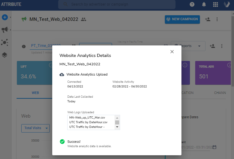 Also in this release, we've upgraded the Website Analytics Modal for campaigns that utilize our Web Log Uploader. This modal will now display the names of files that have been uploaded to make it easier to keep track of which files were used to calculate Web Visits.