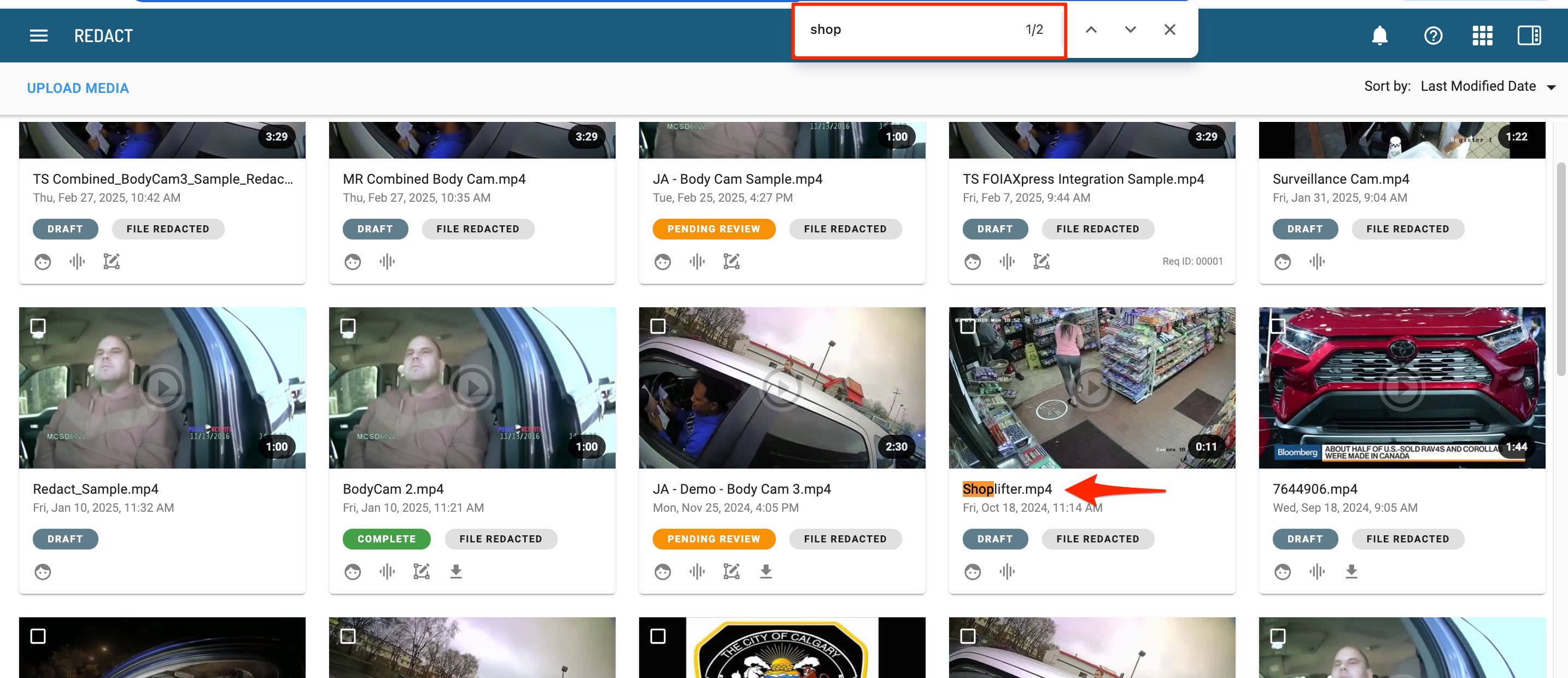 You will also notice different redaction status labels assigned to each file. These labels are intended to help keep your media organized within the homepage. Note: There is no application action tied to the redaction status.