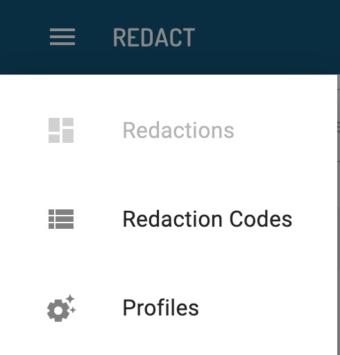 In the upper left corner, you’ll find additional Redact features by selecting the three horizontal bars or hamburger icon. Here you have the option to set up Settings Profiles and Redaction Codes.