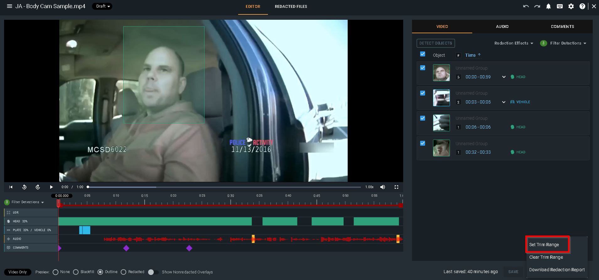 Redact’s trimming feature allows you to easily select start and end timecodes for your redacted output files. You can download specific portions of a video or remove unwanted content at the beginning or end of a file, providing greater flexibility and control over the redaction process.