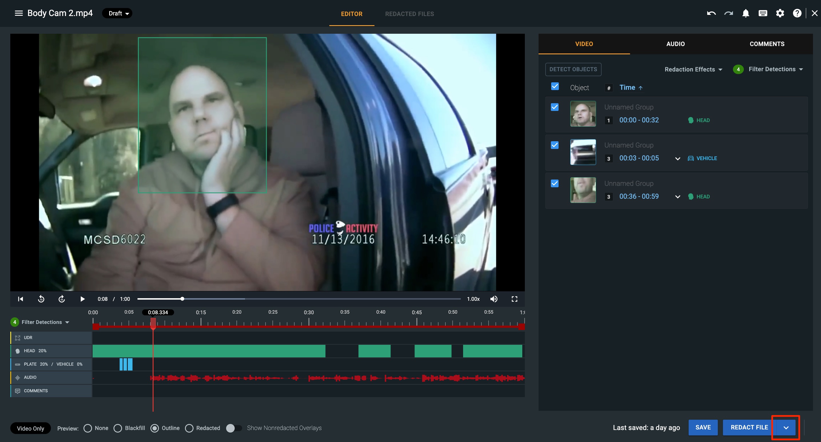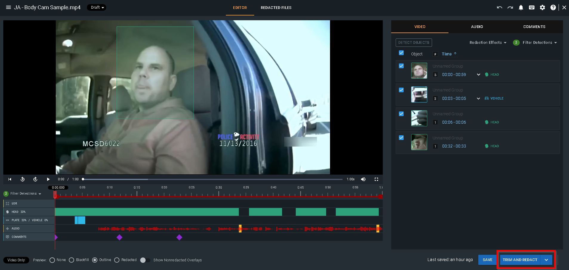 4. Select the Trim and Redact button. Redact will now process your file, generating a redacted version of the file tailored to your specified timecodes. Your redacted output file name will include the timecodes of the trim, providing you with a clear understanding of the exact timestamps in which you have trimmed the video.