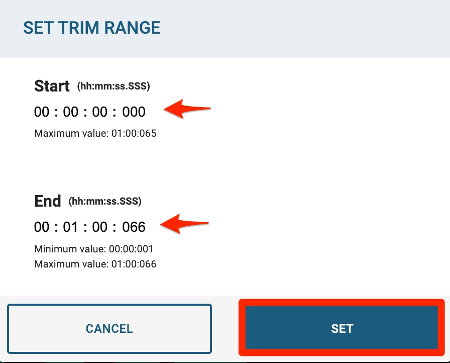 3. Within the pop up modal, enter the desired timecodes to specify the portion of the video you wish to save. Select Set.