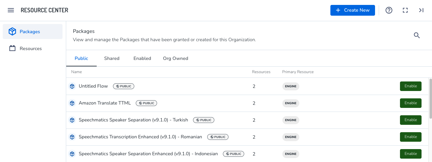 Enabled: Displays a list of all packages that have been successfully enabled for your organization and are ready to use