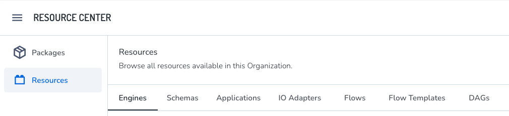The Resources table displays a tabbed list of all the resources (engines, schemas, applications, and flows) that are available to this organization. The tab for each resource type displays detail cards for the resources with summary information. The list can be filtered.