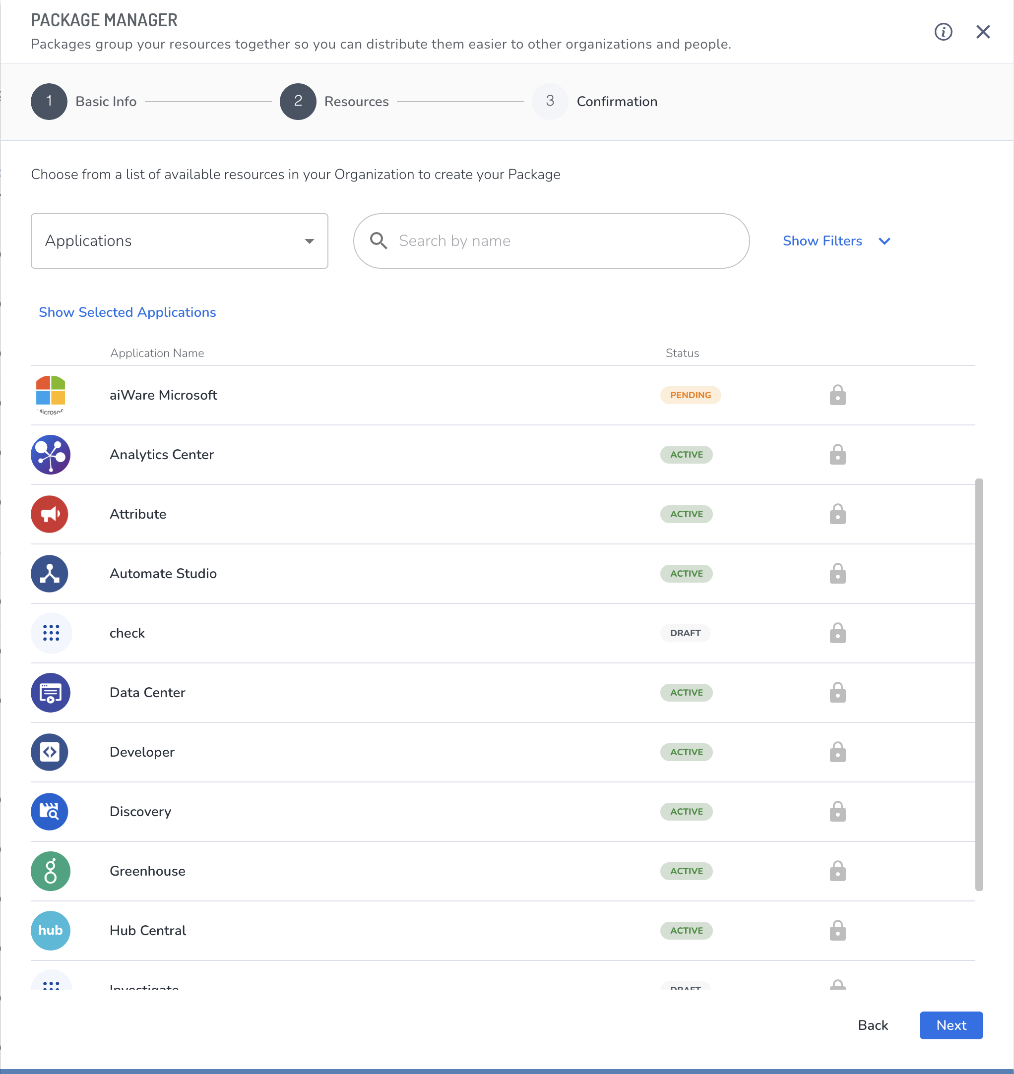 next to the resource you want to add. You can select multiple resource types, and more than one resource of the same type. To get additional information for an individual resource, click on its line in the list to open the Package Details panel. Because the list of available resources can be long, clicking Show Selected will display only those resources that have been selected so far. - Click Next.
