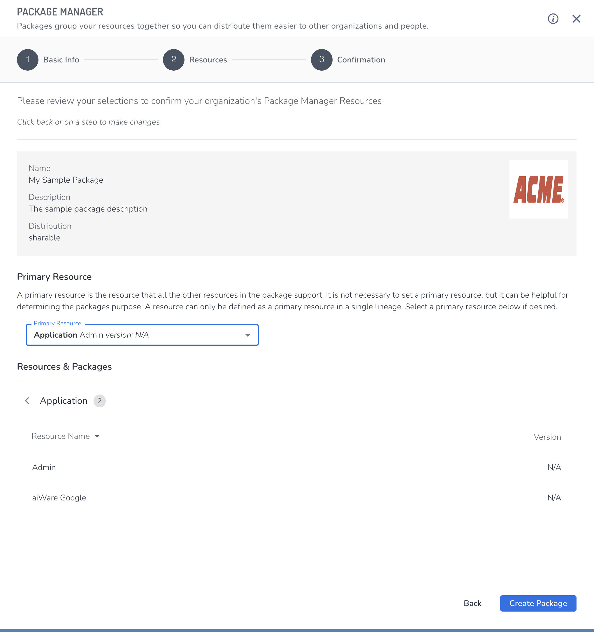 In the Confirmation step, you can select a primary resource for this package. This is not required, but can help determine a package's use.
