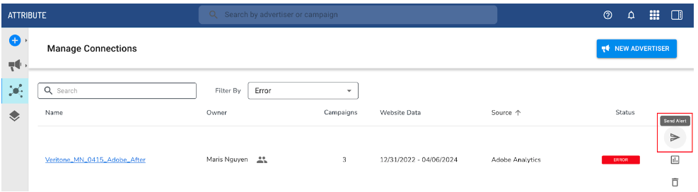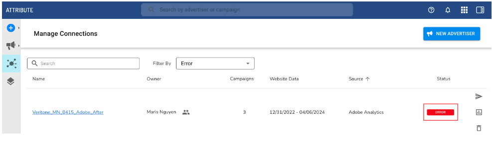 If your Adobe advertiser has a warning or error status, there is an issue with the web connection which may cause a disruption to attribution reporting.