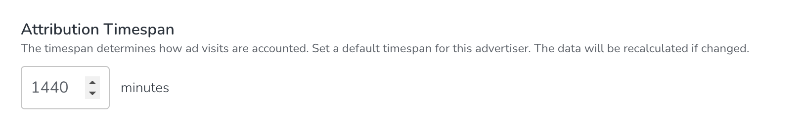 Now during campaign creation and editing, the attribution window designation has a limit of 1440 minutes (or 24 hours). This will allow users to address campaigns with edge cases scenarios, testing purposes, etc. that need a larger than usual attribution window.