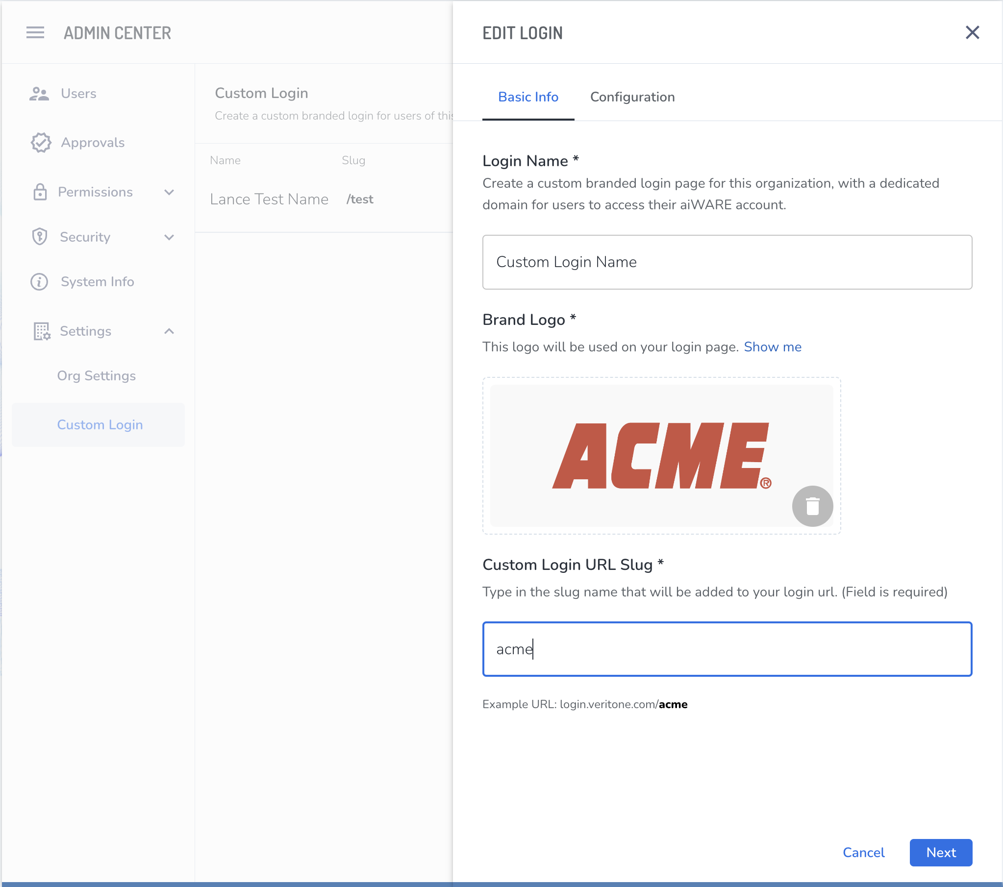 Custom Login URL Slug: Type the name that your organizations users will use to login. The slug is added to the end of the login url and will look like (login.veritone.com/your-slug)