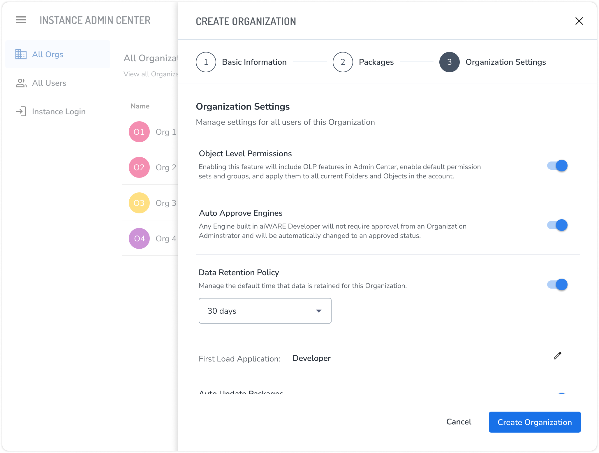 Choose settings for the organization; these are only configurable by an instance admin. Settings control key functionalities, such as determining which application will load first for the organization's users.
