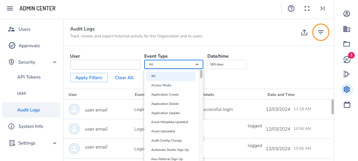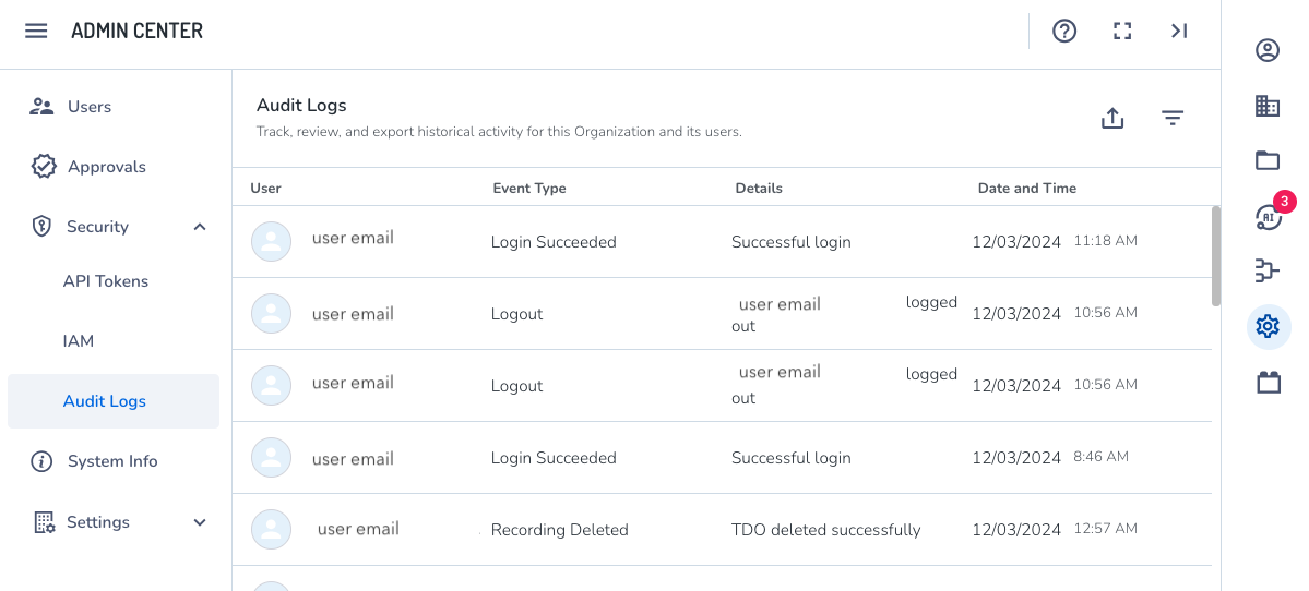 Organization admins can search user activity by various parameters, such as login attempts. Tracking user events can be useful when identifying and solving problems or to understand the purpose behind an activity, which can be later used for accountability or compliance.