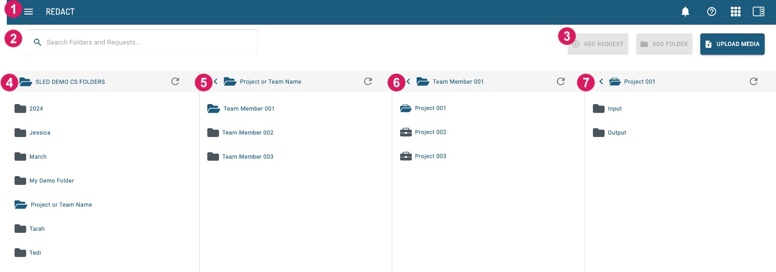 Use the Add Request button to create a new request, the Add Folder button to create a new folder, and the Upload Media to upload media to your input folder. The ability to select these buttons will depend on where you are within the folder structure.