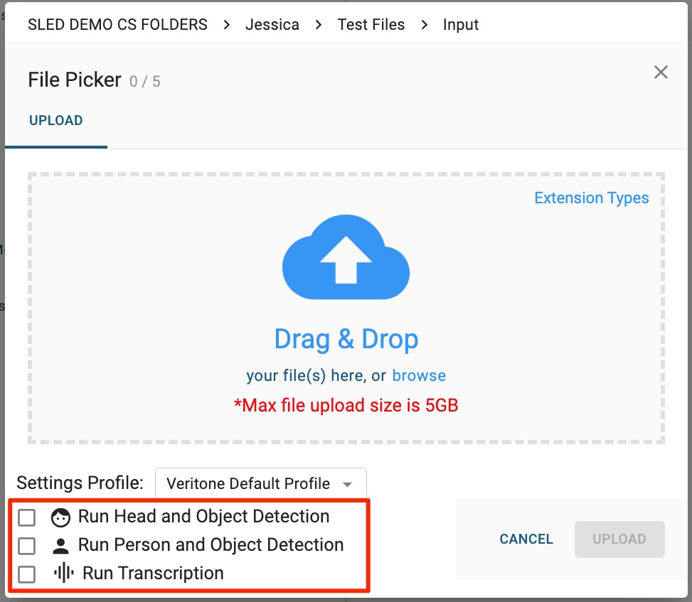 Using the File Picker, select the media you want to upload to Redact. Then, check the box next to each processing option that you'd like to run: