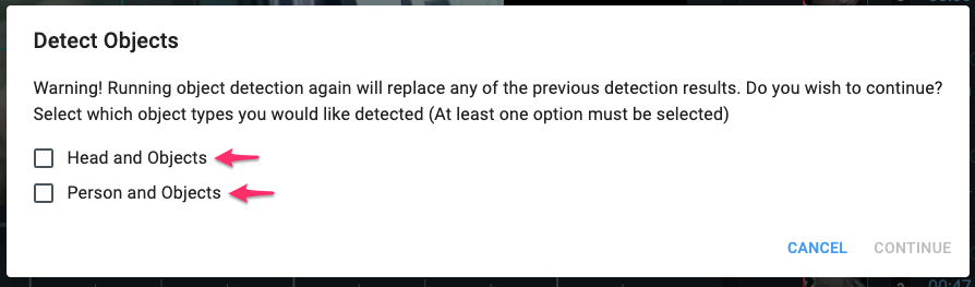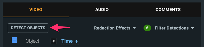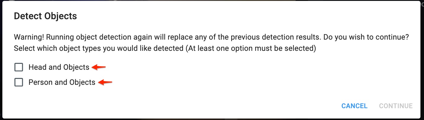 If you did not run head and object detection while uploading your media, you can do so from the File Manager Page, by selecting the Detect Objects button in the video tab.