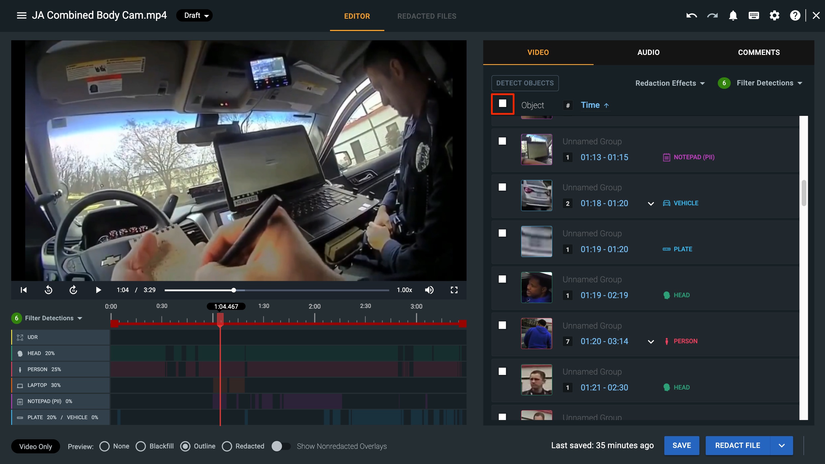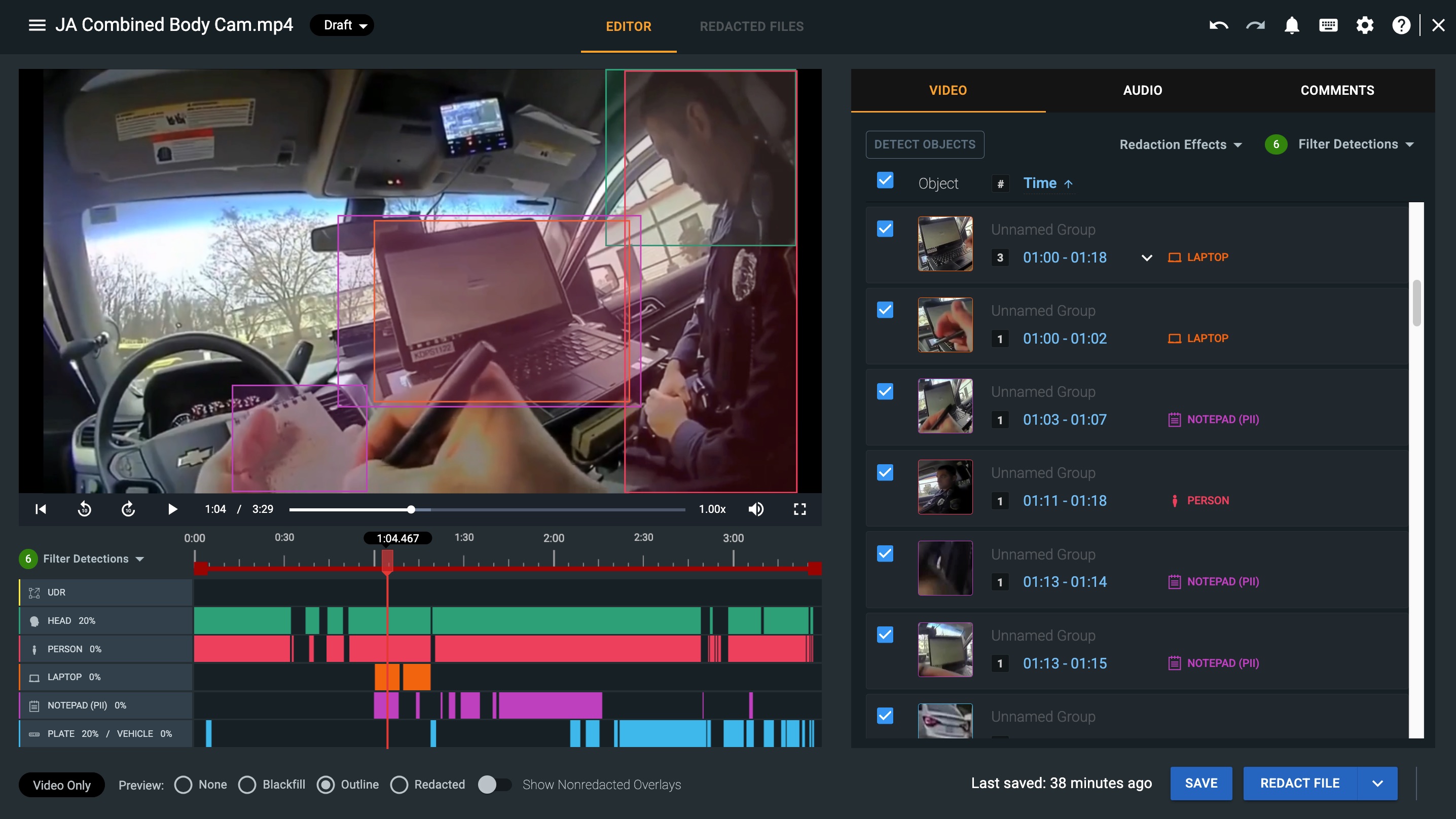 Veritone Redact’s Head, Person and Objects Detection engine works by scanning through your video frame by frame, looking for any heads, persons, laptops, license plates/vehicles, and notepads. This article will review the workflow once you have run auto-detection on your media file.