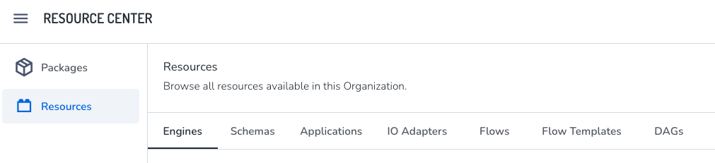 . The Resource Center panel slides out. - Click Resources > Engines tab.
