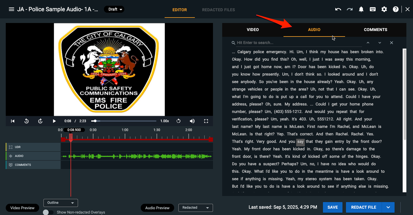 Navigate to the “Audio” tab on the right side of the page to find the machine-generated transcript.