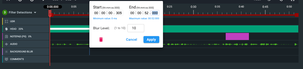 2. Click on the timeline and enter the Start and End times for when you want the background to be blurred.