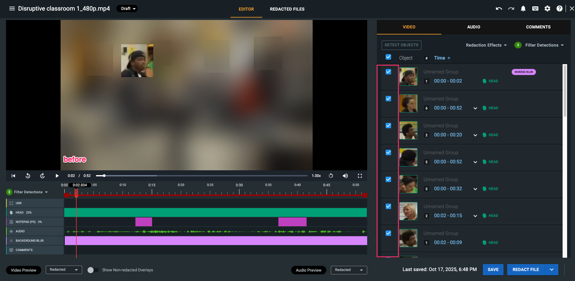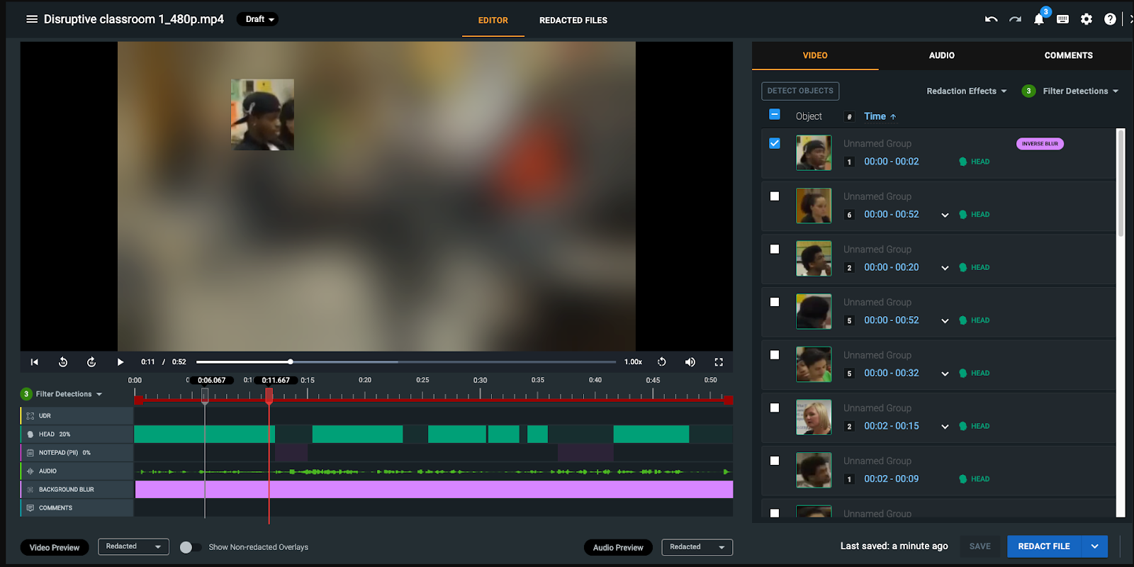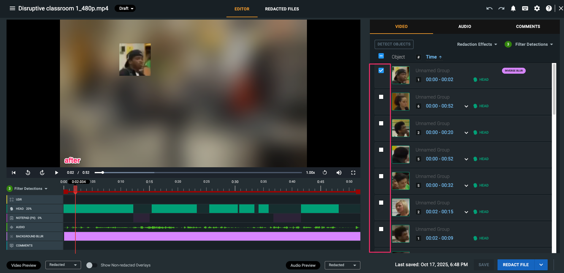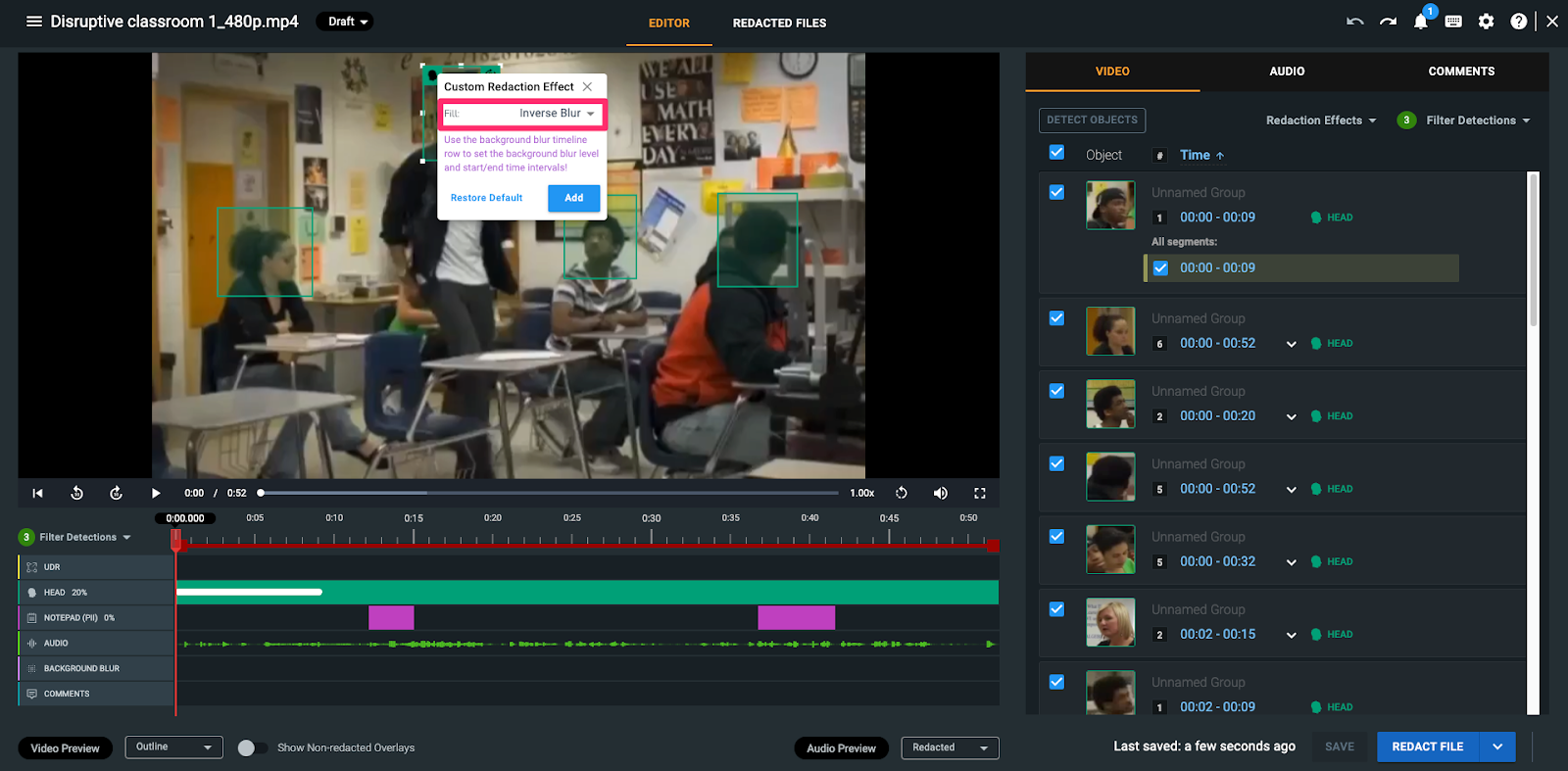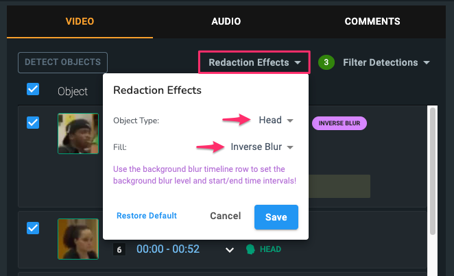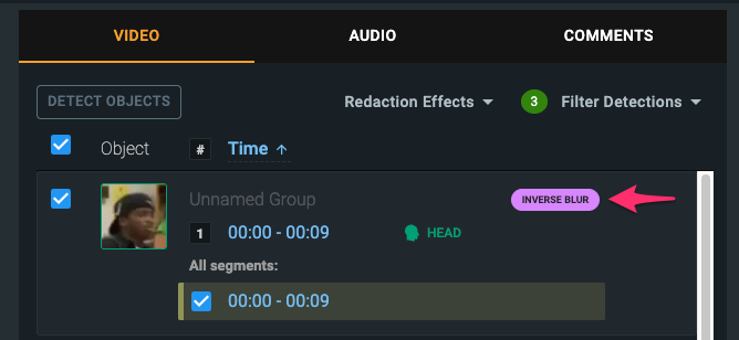4. You will see the Inverse Blur effect applied to that detection in the Video tab.