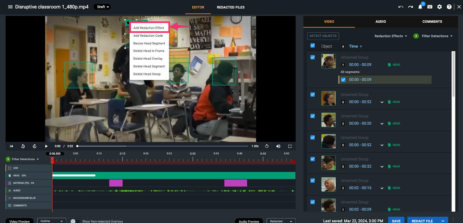 Inverse Blur allows you to redact an entire scene while highlighting one or more persons or objects of interest. This feature is ideal for situations where you must isolate a specific person or vehicle—for example, redacting bodycam footage in a hospital to blur everything except a specific suspect.